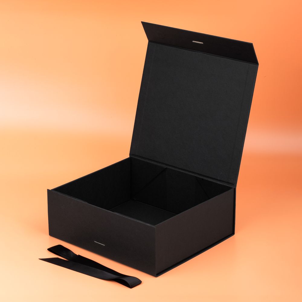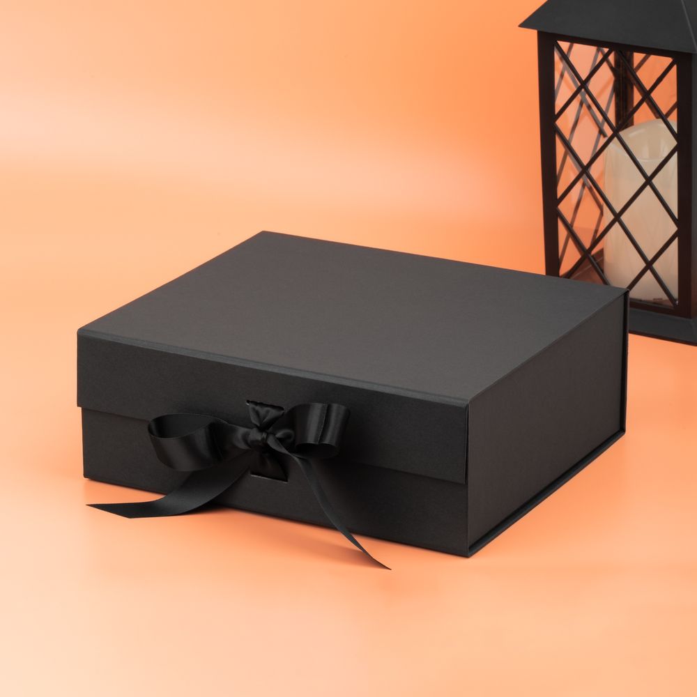 Коробка из переплетного картона, кашированного тонированной в массе крафтовой бумагой. Крышка на двух магнитах дополнительно фиксируется репсовой лентой.Толщина картона 2 мм.