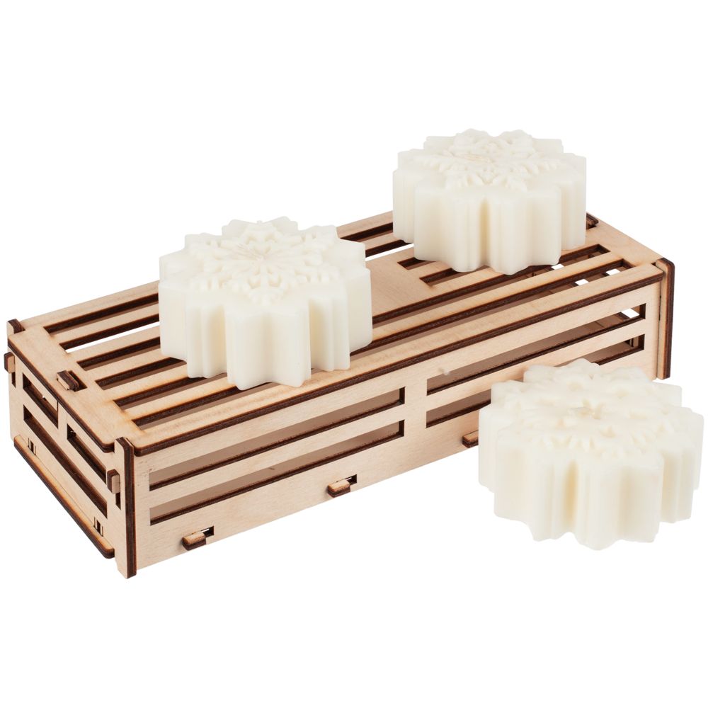 Набор из трех свечей в фанерном ящичке. Каждая снежинка в наборе представлена в своем неповторимом узоре.