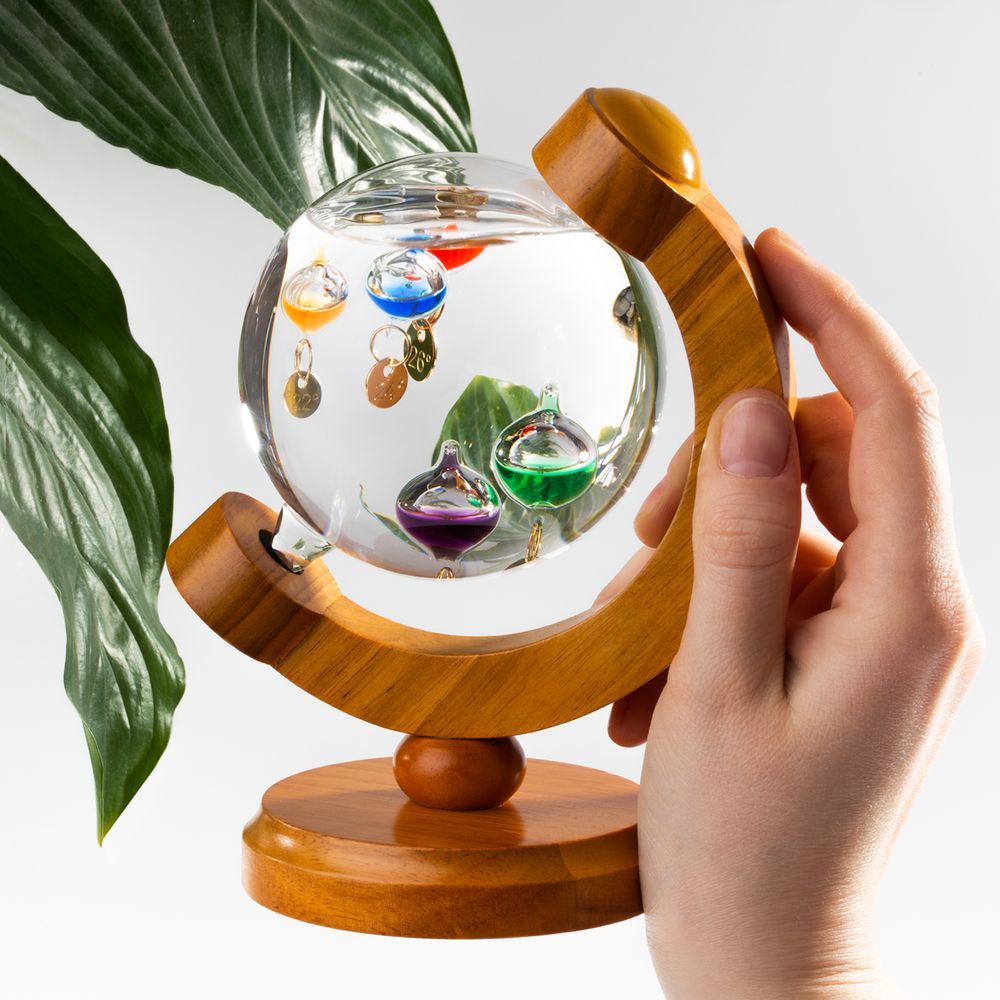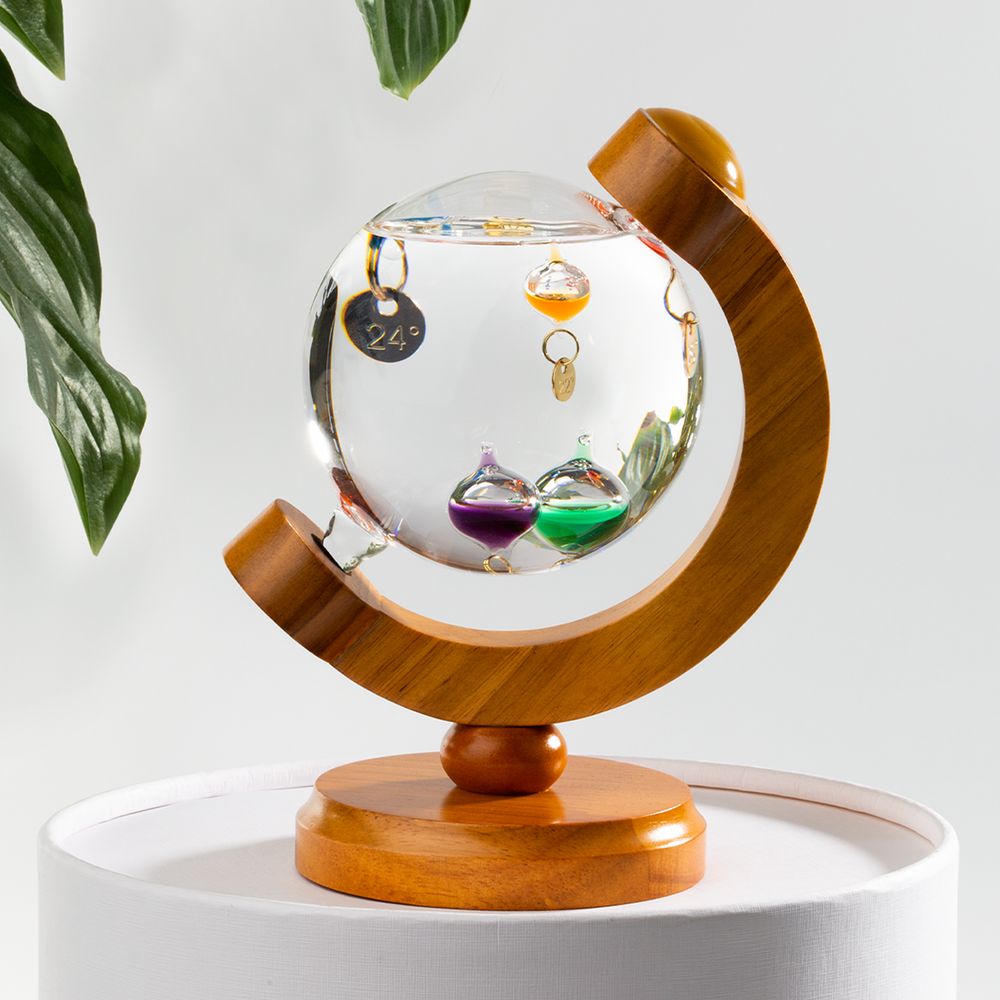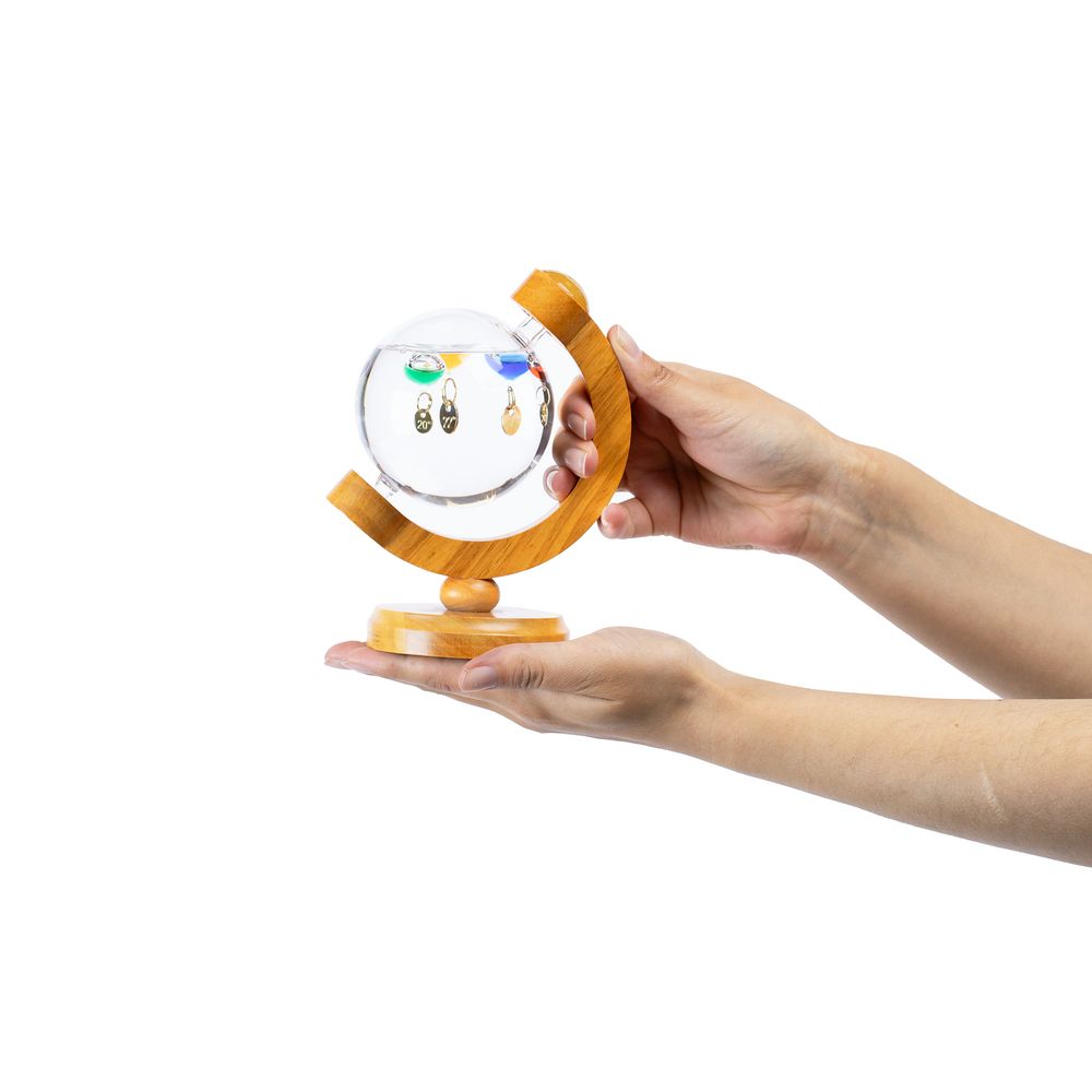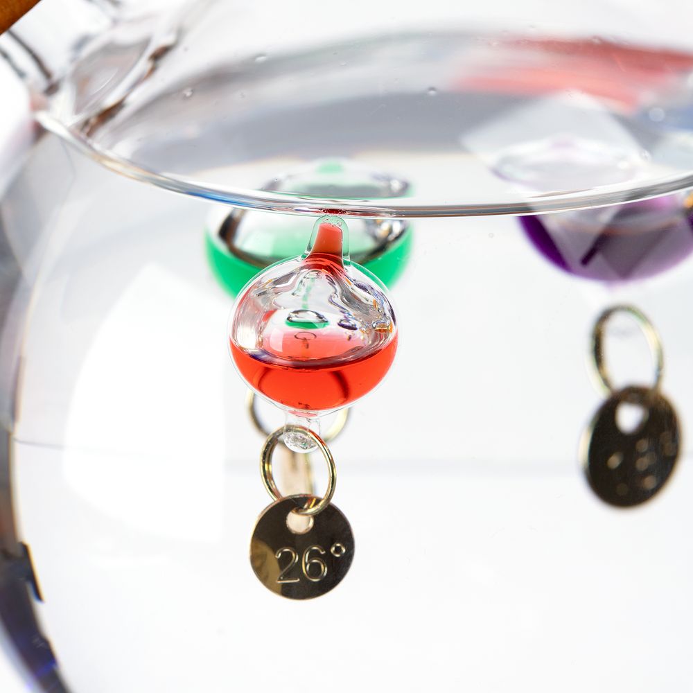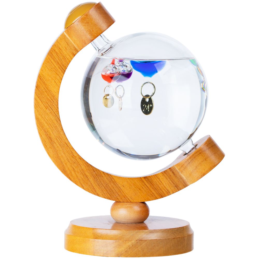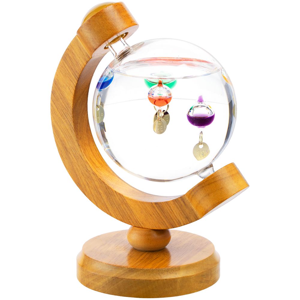 Термометр Галилео оригинальной формы, напоминающей глобус, добавит индивидуальности домашнему или офисному интерьеру. В основе его работы лежит физическая закономерность, впервые отмеченная великим Галилео Галилеем: плотность жидкости увеличивается при снижении температуры и уменьшается при ее повышении. И теперь стеклянные шарики в жидком парафине не только радуют глаз, но и позволяют с легкостью определить температуру в помещении.