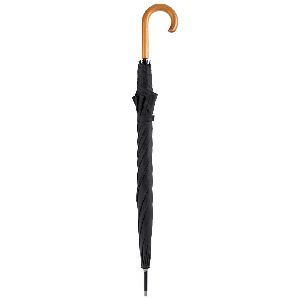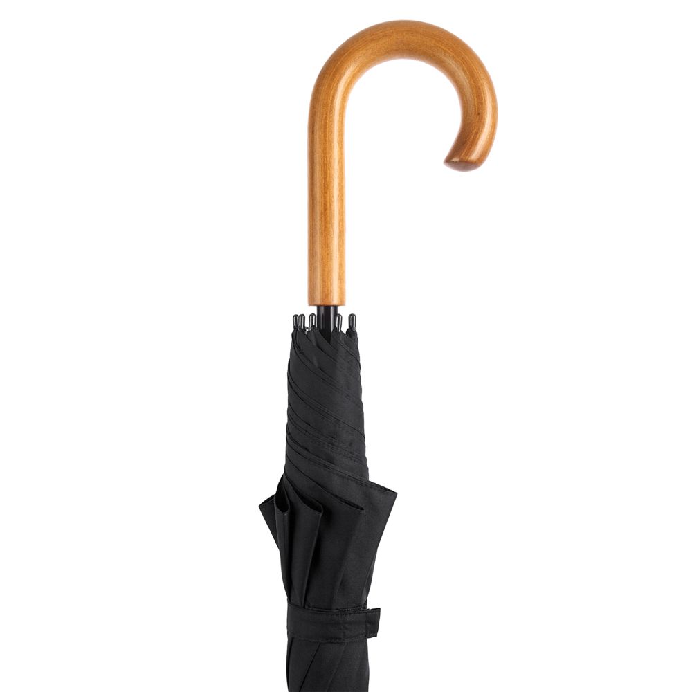 Элегантный зонт с большим куполом и деревянной J-образной ручкой.