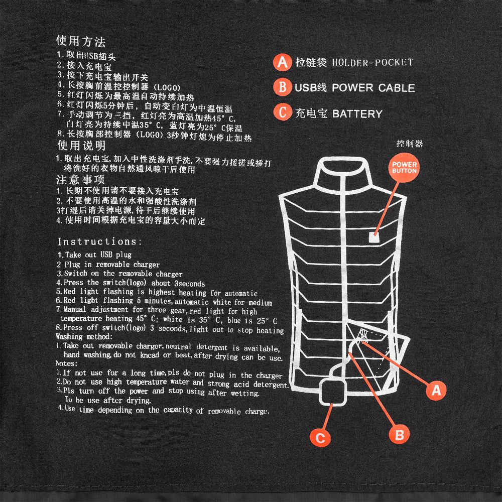 Утепленный жилет со встроенным нагревательным элементом из углеродного волокна в области спины и шеи. Работает от внешнего аккумулятора (в комплект не входит), подарит ощущение тепла и комфорта в любую погоду.