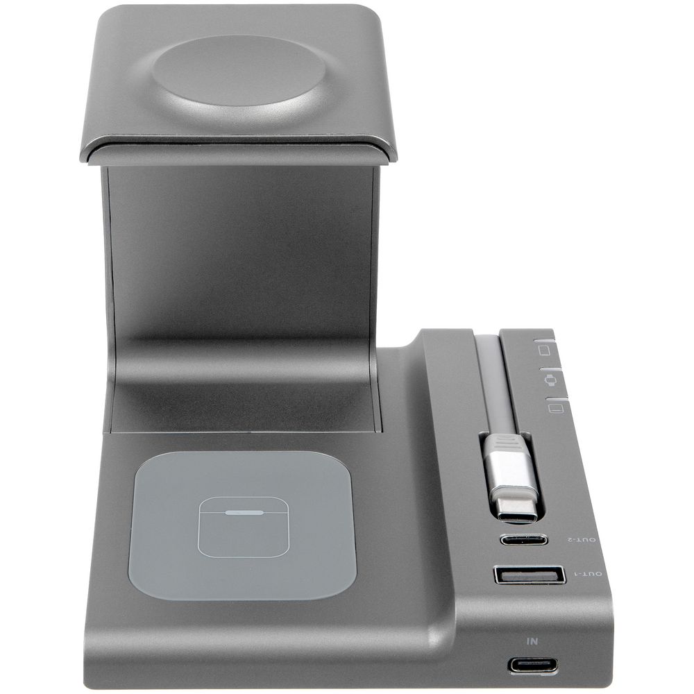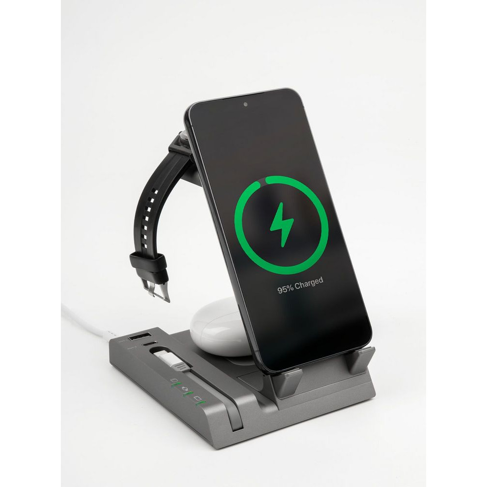 Зарядная станция Tres высшего уровня сложности позволяет заряжать до 5 гаджетов одновременно: телефон, часы Apple Watch 2–8, наушники с поддержкой протокола беспроводной зарядки Quick Charge и еще 2 устройства через кабели с разъемами USB-А и Type-C.
